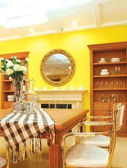 新鮮色彩需要細節(jié)點亮 紅葉桉木餐廳家具典雅而不滯重,透明珍珠白餐椅面輕松明快,刷成明黃色的背景墻既明麗可人,又不露鋒芒;古典掛墻鏡略帶洛可可風格,華麗而神秘……這個餐廳空間看不到一絲慵懶和沉悶,一束白玫瑰不經(jīng)意地點綴其中,整個空間跳躍著的滿是春的鼓點。