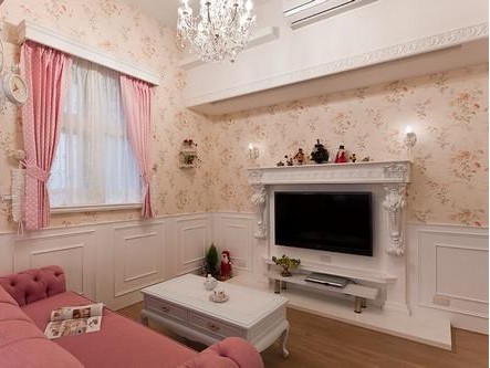 客廳。田園風(fēng)的壁紙,歐式純白電視背景墻與粉色沙發(fā),都是絕美的色調(diào)搭配,整個(gè)空間設(shè)計(jì)精致、唯美。