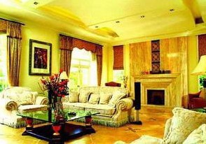 本案例中力求在簡約化的歐式氣息中,彰顯主人的文化追求和藝術(shù)品位。豐富的光影使室內(nèi)的線條錯落有序。木質(zhì)的電視墻裝飾別具一格,沙發(fā)的一側(cè)是裝飾壁爐,米色大理石的地面以少許深色圖案作為點綴,鮮亮的色彩對比使整個空間顯得高貴、生動。