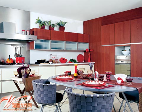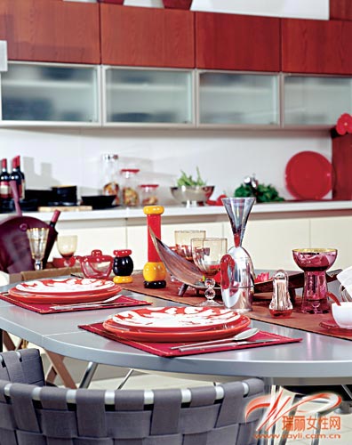 概要: 布置多人就餐空間 橢圓形餐桌+移動置物架+紅色餐具飾品 配有橢圓形餐桌和移動置物架的廚房,可容納多人用餐,是大家庭節(jié)日聚餐的理想場地,雖然餐桌椅的顏色、烹飪區(qū)的不銹鋼金屬顏色有點冷,不過,巧用中國紅就能把這兩處的色彩提亮起來。節(jié)日聚餐,餐桌上自然是中國紅布置的重點,低柜臺面和木質置物架上做輔助性烘托、點綴。