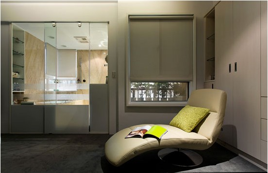 運(yùn)用清玻璃及卡典西得的材質(zhì),成為與衛(wèi)浴空間的中介因子,下方條紋的語(yǔ)匯與主臥床頭應(yīng)對(duì)著。地面深灰色運(yùn)用使整個(gè)空間看上去不是那么的蒼白。