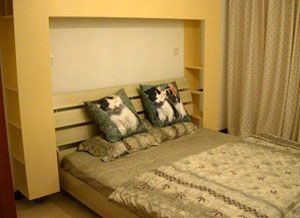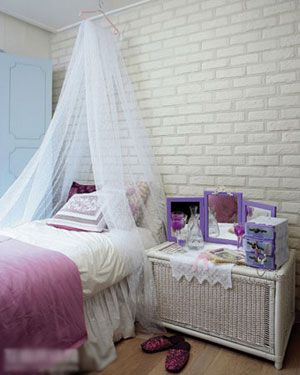 就一般床的構(gòu)造而言,床頭的高度欠缺氣勢。因此,對床頭的那面墻有必要進(jìn)行特別的裝飾,如用板材或裝飾布等,裝飾出幾平方米的面積;此外,用紡織面料制作的床頭的“床幔”,好似人的頭飾,大有可為,如用窗簾布垂掛、對開等造型,猶如給床戴上了花頭巾。
