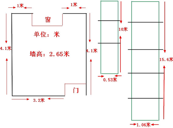 4面墻:4米+4米+窗兩邊1+1+3.1=13.1米(周長是13.1)高度是2.65米