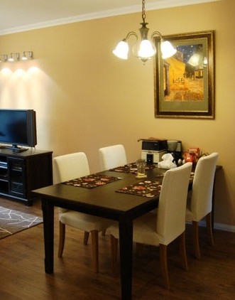 餐廳的墻面材料以內(nèi)墻乳膠漆較為普遍,一般應(yīng)選擇偏暖的色調(diào),如米白色,象牙白等。為了整體風(fēng)格的虛實(shí)協(xié)調(diào),餐廳需要一個(gè)較為風(fēng)格化的墻面作為亮點(diǎn),這面墻可以重新描繪一下,采用一些特殊的材質(zhì)來處理,如肌理效果,通過對(duì)其款式的選擇,可以烘托出不同格調(diào)的氛圍,也有助于設(shè)計(jì)風(fēng)格的表達(dá)。