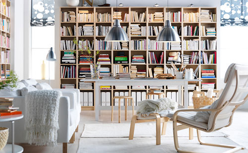 許多小戶型的房子是不會有一個剩余的房間作為書房的,然而對于現(xiàn)在白領(lǐng)來說,沒有書房的空間總想是缺少些韻味。利用客廳有限的空間,將書房融入進客廳里。小戶型的客廳并不適合大沙發(fā),小巧的兩座沙發(fā),實用又溫馨。利用客廳剩余的空間,沿著墻壁,窗戶安置挑高的書架,并在窗邊的書架前放置一個簡單實用的白色書桌,既不占空間,又實現(xiàn)了書房的功能。而書房與客廳的聯(lián)合搭配,既實現(xiàn)了空間的合理利用,又達到了時尚的感覺。