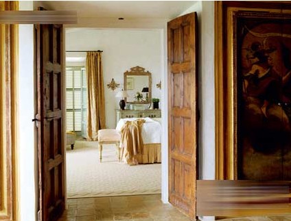 由德國(guó)室內(nèi)設(shè)計(jì)師NonavonHaeften設(shè)計(jì)的西班牙馬略卡(Mallorca)的一間大屋,整間屋的設(shè)計(jì)風(fēng)格和裝飾擁有濃厚的法國(guó)和西班牙風(fēng)味。圖中是主人房門前的一場(chǎng)景。主人房前擺放了不同的古董油畫和藝術(shù)品,看過(guò)展覽后一打開門就是舒適的主人睡房,不要以為這一對(duì)厚木門不怎么樣,它本身也是一對(duì)古董西班牙木門,是屋主的展品之一。厚厚的整塊木板和簡(jiǎn)單而堅(jiān)實(shí)的門柄配上幾何圖形的花紋,把藝術(shù)展覽和舒適睡眠之地分隔起來(lái)。