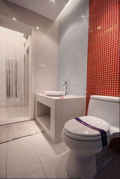衛(wèi)生間的色彩也出挑,在馬桶的一側(cè)做出一些馬賽克拼接,依然是紅色主題。