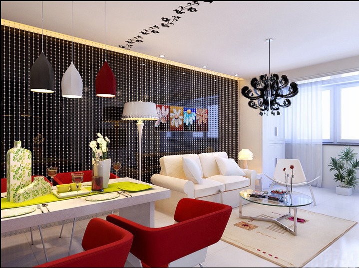 由于空間有限的緣故,客廳和餐廳自然是合二為一的??蛷d是家中最主要的活動(dòng)區(qū)域,它應(yīng)該寬敞、方便。利用大量的烤漆玻璃和白色的家具,讓整個(gè)空間在視覺圣桑變得實(shí)際上大很多。背景墻采用深色系,同白色相呼應(yīng),空間也得到拉升的效果。