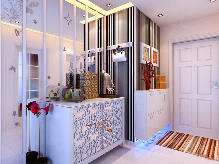最后看一下玄關(guān)。門廳的基本功能就是放置鞋子和掛衣物,入戶門側(cè)是翻板式的鞋柜,在拐角處放置了一排掛鉤,客廳門前右邊的墻上用了處花紋銀鏡配以木條裝飾,在保證了空間的延伸感同時(shí)不至于眩目。在裝飾銀鏡前放置一組漂亮的裝飾柜,保證了空間合理的利用。