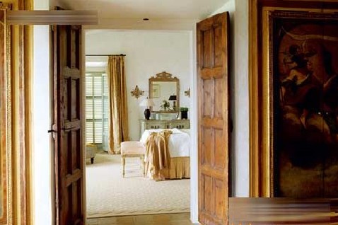 由德國室內設計師NonavonHaeften設計的西班牙馬略卡(Mallorca)的一間大屋,整間屋的設計風格和裝飾擁有濃厚的法國和西班牙風味。圖中是主人房門前的一場景。主人房前擺放了不同的古董油畫和藝術品,看過展覽后一打開門就是舒適的主人睡房,不要以為這一對厚木門不怎么樣,它本身也是一對古董西班牙木門,是屋主的展品之一。厚厚的整塊木板和簡單而堅實的門柄配上幾何圖形的花紋,把藝術展覽和舒適睡眠之地分隔起來。