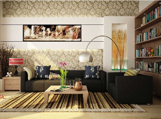客廳中視聽主題墻比較多見。由于它地處客廳的中心位置,因此也較容易成為人們視覺的聚焦點,視聽主題墻的設(shè)計應(yīng)在其空間功能的基礎(chǔ)上,根據(jù)其空白面積的多少進(jìn)行構(gòu)思。材料的使用可以是無限制的,但應(yīng)體現(xiàn)主人的個性,并把其獨特的品位引入其中。由于視覺的特殊功能,因此在視聽設(shè)備的正后面,選擇吸音的材料會更好地體現(xiàn)它的功能性,如吸音好的地板、文理粗糙的壁紙、有肌理效果的石材或故意作出的粗糙墻面等。另外,運用這樣的材質(zhì),還能在墻面上拼貼出異乎尋常的畫面效果,形成綜合的視覺回饋。但視聽主題墻的設(shè)計要特別注意嚴(yán)整,避免零亂;其次色彩和材質(zhì)在保持新穎別致的同時,也要注意不與整體的客廳環(huán)境相矛盾,除非你的墻面很小,可以被當(dāng)作展示個性的角落,否則越大的墻面,就越注意整體的和諧。