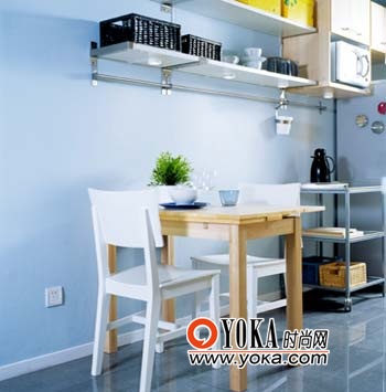 小戶(hù)型的類(lèi)似功能區(qū)應(yīng)盡量合并、重疊,如廚房和餐廳區(qū)域的共用,走餐廳廚房一體化的路線(xiàn)。可延展的餐桌和帶有滑輪的推車(chē)都能靈活運(yùn)用于這樣可變換功能的廚房里。