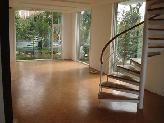 筆者觀察到,軟木地板的生產(chǎn)過程十分嚴謹,軟木樹皮在被加工成地板之前經(jīng)歷了一系列歷練過程:打碎、篩選、過濾、攪拌、熱壓、固化、飾面等,其中熱壓成型的工序,令顆粒狀的軟木原料形成了一個穩(wěn)定均衡的整體,盡管軟木天生具有微小氣囊,但經(jīng)過處理的軟木已經(jīng)成為純凈的軟木顆粒,之后以一種人工熱壓的方式重新排列在一起形成新的結(jié)構(gòu)系統(tǒng),對于外部來說,它是完全致密而封閉的,不會滲油滲水,達到一定含水率的軟木地板不容易受潮變形,更不會藏污納垢。另外,經(jīng)過表面特殊處理的軟木地板還可以用于廚房衛(wèi)生間等潮濕空間。