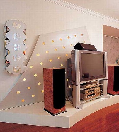 客廳是與客人交談的地方,一組沙發(fā)、茶幾,在功能上講也就足夠了。但客廳同時(shí)也是家人休閑相聚的場(chǎng)所,而目前大眾家庭娛樂(lè)的手段主要是看電視、看VCD、唱卡拉OK等,所以客廳中的電視墻便面了焦點(diǎn),成了最能體現(xiàn)主人個(gè)性化的地方。