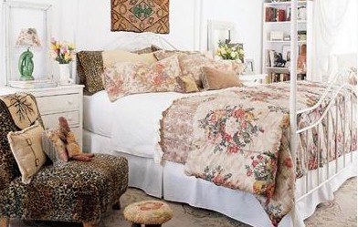 以白色為基調(diào)的臥室,看起來(lái)未免有些美中不足。古典花紋的印花織物以及地毯,搭配白色的窗簾和鐵藝床,使整個(gè)空間明媚中蘊(yùn)涵著沉靜的氣息。豹紋沙發(fā)的點(diǎn)綴好似平靜水面上激起的浪花,帶來(lái)**與活力。