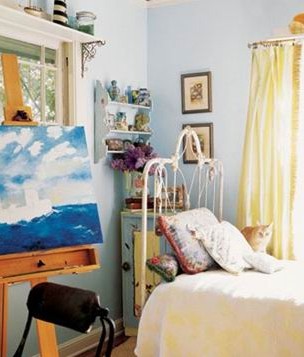 最適合于夏日午后時(shí)光流連的舒服小床,簡(jiǎn)潔的鐵藝床頭富于美感,手感厚實(shí)溫暖的白色床罩和窗簾,搭配淺藍(lán)色的墻壁和家具,氣氛寧?kù)o。大小不同的靠墊有很好的裝飾效果。