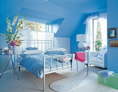 藍(lán)色清涼寧?kù)o的氣氛令人感覺(jué)撫慰與放松,通過(guò)深淺不同的藍(lán)色參差的對(duì)比,以及格子與花朵圖案的微妙搭配,使臥室單純而不單調(diào),帶著海一般的夢(mèng)幻感覺(jué)。