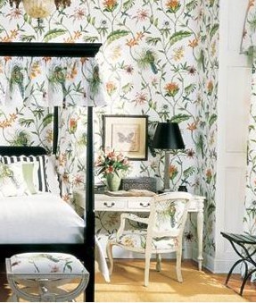 紛繁富麗的墻布令人感覺(jué)仿佛走進(jìn)野花遍地的樹(shù)林,林中蕭蕭的樹(shù)葉聲中傳來(lái)清幽的鳥(niǎo)鳴,黑胡桃木的床好象就擺在樹(shù)林中,白色的床罩和黑白條紋的靠枕簡(jiǎn)潔而理性,與漂亮的墻布形成鮮明而生動(dòng)的對(duì)比。