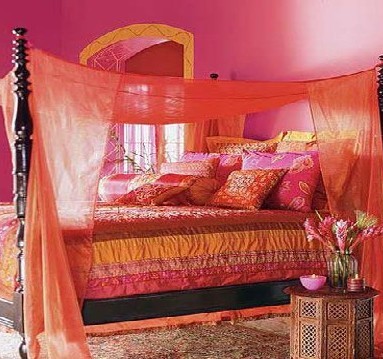 為了追求臥室空間的浪漫、溫馨,設(shè)計(jì)師選用溫和的粉紅色作為主調(diào),墻面、頂面、地板和諧搭配。由于陽臺(tái)的啞口過寬,空間交流太過充分,所以做了紅色方磚墻柱來分割空間,美化了居室。
