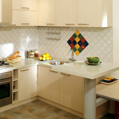 第一步選材料鋪地材料應選用防滑地磚,墻面應選用方便清理的釉面磚,木質的櫥柜應用防火板貼面,既易清潔又可保安全;烹飪灶臺應用大理石或云石板,以能防火為佳。