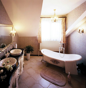 女主人CORRINE是一個讓人感覺很淡定的人,她曾在英國生活過一段時間,因而對于自己的居室空間有獨到的想法。由于夢想在大汗淋漓后能有一個舒服而不受打擾的沐浴環(huán)境,CORRINE決定將原來別墅頂部的閣樓改建為奢華的衛(wèi)浴空間。風格則是她偏愛的歐式復古風格,貓爪式獨立浴缸、防水壁紙、雕花洗手臺充分體現(xiàn)了她的品位和喜好。