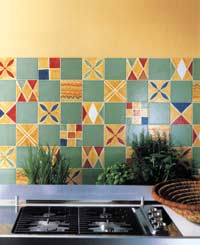 在廚房中小尺寸的瓷磚近來(lái)比過(guò)去更加流行,很多人發(fā)現(xiàn)小尺寸的正方形瓷磚可以砌出許多意想不到的變化,非常適合小面積的廚房墻面,有的小瓷磚規(guī)格只有5至13厘米,而且小磚也可用作點(diǎn)綴,效果極佳。 上海裝潢網(wǎng)