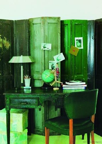 這件堪稱完美的屏風(fēng)其實(shí)是用舊櫥門改造而成,它還有一個實(shí)際的用途,那就是當(dāng)擺放在書桌邊的記事欄,有了它,我們就可以不用每天對著傻傻的電腦屏幕看東西了。其實(shí)你完全可以自制,是開玩笑嗎?當(dāng)然不是!那我們就動手吧:先在板上涂一層磁化層,便于我們?nèi)蘸筚N上小便箋之類的東西,接著再在上面涂上具有英式風(fēng)格的褐色,那樣看起來會很時尚。為了使改造后的屏風(fēng)具有做舊效果,我們可以使用一些化學(xué)原料——堿式碳酸鉛溶劑來處理屏風(fēng)的表面紋理,也可以用砂紙手工打磨,這會讓它呈現(xiàn)出古舊的效果。
