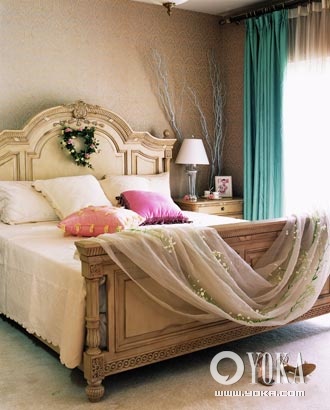 很多西式家具已有繁復(fù)的花紋,所以就不宜到處是繁花叢簇。至于婚房所添加的裝飾物的色彩,自然也是多用淺淡的顏色,如淡綠色、淡粉色、淡藍(lán)色,是最常用的調(diào)節(jié)臥室氣氛的色彩。在擺放時(shí),則要留心自然、恬靜感。小物件的布置上,不必中規(guī)中矩地將其擺放得非常整齊??此谱匀?、隨意地?cái)[放于居室內(nèi)才是上佳之舉。