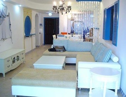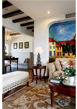 用白色椅面的沙發(fā)坐椅給客廳鋪展一片白沙般的夏日效果,沙發(fā)布藝應(yīng)該以棉織物為主,圖案選擇格子、條紋或花朵圖案都很恰當(dāng),簡單卻豐富的藍(lán)白組合圖案最易傳達(dá)出普羅旺斯鄉(xiāng)村的獨有神韻。沙發(fā)區(qū)可以鋪一塊圖案繁復(fù)的歐式地毯,來表現(xiàn)鮮明的異域感。墻面使用淡黃色,可以讓圓拱穹頂更加明朗、柔和。地中海風(fēng)格的住宅少有浮華的裝飾,生活空間的休憩區(qū)力求柔軟舒適,最后,在藍(lán)白主色調(diào)中加入一點紅,營造純樸輕松的環(huán)境。