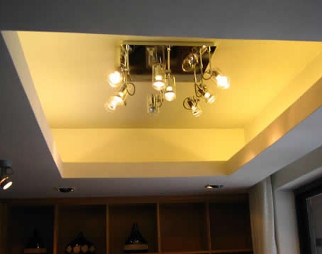 現(xiàn)代住宅普遍層高都在2.8米左右,如果客廳屋頂再采用造型天花來(lái)裝飾,就會(huì)因屋頂壓得太低而讓人有強(qiáng)烈的壓迫感。對(duì)于這種情況,可采用四邊低而中間高的天花造型,這樣一來(lái),不但視覺(jué)上較為舒服,而且天花板中間的凹位形成聚水的“天池”,對(duì)住宅大有裨益。若再在聚水的“天池”中央懸掛一盞金碧輝煌的水晶燈,則會(huì)有畫龍點(diǎn)睛之效,但切勿在天花板上裝鏡。另外,吊燈也不宜有尖銳的形狀。