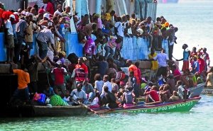 1月20日,災(zāi)民們在太子港一個港口登船準備離開。