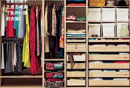 年輕人衣服多,尤其是女性,有的衣服穿兩次就隨便亂放,過一段時間想要再穿就想不起來放到哪里去了。為使衣物一目了然,便于尋找,除去必要的疊放區(qū)和置物空間,盡量多配置掛衣空間,也可選擇掛褲架,使衣物分類放置,這樣您在收拾的時候,自動就會將它們分開,目的明確,找起來自然就不難。如有必要可再配置一些抽屜或領(lǐng)帶盒,專門放置皮帶、襪子、領(lǐng)帶、絲巾等小件物品。如果您是夫婦二人,可以考慮劃分男女儲衣空間。