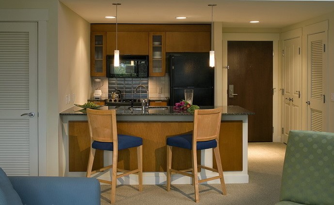 空間較小的情況下,廚房不適合單獨(dú)隔起。這樣的島臺(tái)的設(shè)計(jì)既將廚房與其他空間相隔離,又營(yíng)造了時(shí)尚的居家氣氛。
