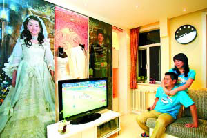 客廳電視墻里展示著主人的結婚禮服,滑動門上是兩個人復古宮廷裝的婚紗照。