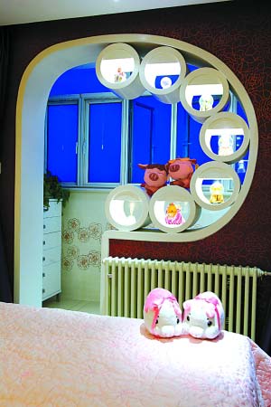 大多數(shù)的老房子都有寬大的陽臺,房間和陽臺一般用玻璃窗隔起來。由于這個隔斷是不能被打掉的,于是就使用了夸張的造型。將老式的窗戶拿掉,用夸張的圓圈作為隔斷,既能有好的視覺效果,又能弱化老式戶型的拘束感,還能讓視覺不被完全隔斷。