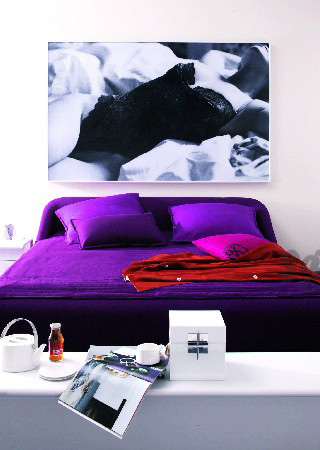 概要: 簡單的黑白兩色構成主色調,純黑的墻面、鋪天蓋地的更衣柜、木地板,構成一種比較前衛(wèi)的臥室布置,而上部裸露的白墻、天花板上白色吊燈、白色地墊這些大面積的白色調又調和出整體空間的純潔美感。床頭的橙紅靠板、更衣間的橙色座椅,映襯著黑色床框,分外鮮明生動?!『诎譜S淺紫 夏日炎炎,家成了避暑的港灣。