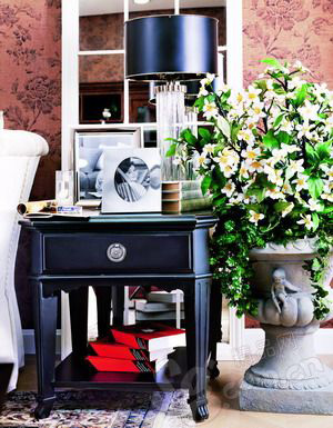 黑色的臺燈罩在透明水晶的背景襯托下,香艷無比。沙發(fā)和邊柜形成最簡單直接的黑白配,為了減少沉悶感,灰色仿古花盆中怒放的五角白梅增添了不少婉約的詩意。