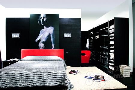 簡單的黑白兩色構成主色調,純黑的墻面、鋪天蓋地的更衣柜、木地板,構成一種比較前衛(wèi)的臥室布置,而上部裸露的白墻、天花板上白色吊燈、白色地墊這些大面積的白色調又調和出整體空間的純潔美感。床頭的橙紅靠板、更衣間的橙色座椅,映襯著黑色床框,分外鮮明生動。