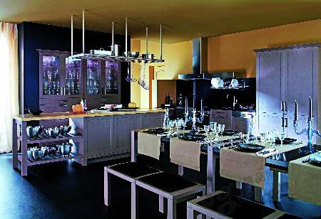 鄉(xiāng)村風格的廚房偏愛使用的原木色,能夠還原木材本身的自然美感。在原木基調的廚房中運用白色柜體和臺面,可以把狹小的空間變得富有縱深感。由于顏色過深,廚房中很少會有大面積、整體的黑色,但黑色餐桌、金屬嵌黑網格紋椅、黑色燭臺作為一種點綴出現(xiàn)則別有韻味。