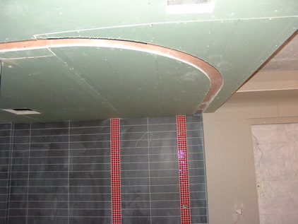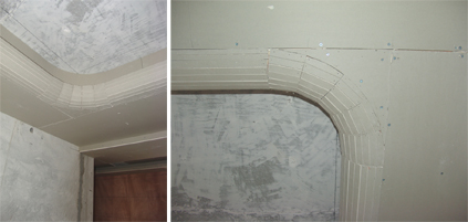 流暢的圓弧是師傅們將石膏板裁成好多細(xì)長條拼成的,頂面還做了精確的彈線定位,這不僅需要技術(shù),還需要師傅們極大的耐心。