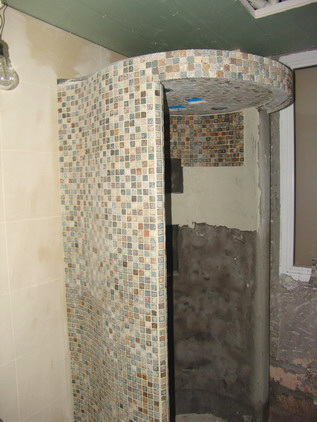 沐浴房安裝的嵌入式花灑是在鋪貼馬賽克之后,師傅們在鋪貼工作中細(xì)致地劃分區(qū)域預(yù)留位置。