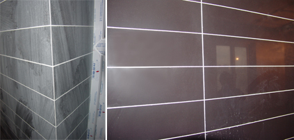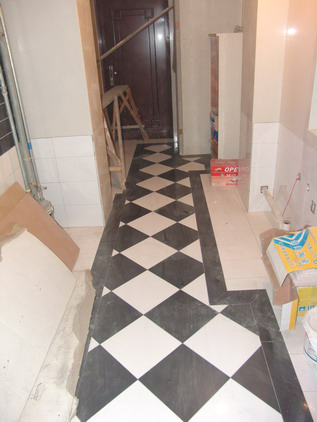 縱橫有致的瓷磚鋪貼其實也十分講究,這光滑的邊角和整體的平面效果不是輕易貼出來的,所有直角對拼邊緣部分都經(jīng)過45度的切割,和長條面磚拼接時一樣,連接處所有的縫隙都要很均勻地填補,這樣看上去才有整體質(zhì)感。