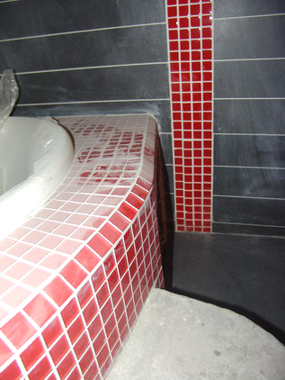 看看浴缸邊緣(白色浴缸部分)的馬賽克裝飾,轉(zhuǎn)角的馬賽克都是從小方塊仔細(xì)切割拼貼而成的,渾然一體。