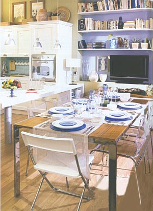 在這35平方米空間里可說是五臟俱全。一張餐桌、六把餐椅,占據(jù)了客廳的所有活動空間,但有了可伸縮的餐桌,在不聚餐的時候,客廳里的活動空間可被完整地還原。金屬結(jié)構(gòu)、橡木臺面的餐桌搭配半透明水晶外殼的椅子,布置出簡潔的就餐領(lǐng)地。準(zhǔn)備若干把可折疊的椅子是必要,方便就餐客人人數(shù)的增減。白色的桌布、藍(lán)白兩色的餐具干凈清爽??臻g雖小,與朋友相聚的快樂卻一點(diǎn)都不會減少。