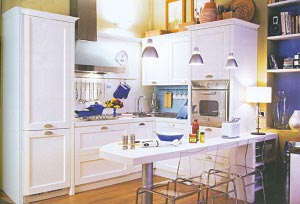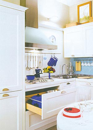 白漆櫥柜令小廚房充滿了明亮印象,人造石臺面與櫥柜渾然一體,品質(zhì)感絲毫不減。在與壁柜相接的空白墻面上,天藍(lán)色玻璃馬賽克令流動的視覺產(chǎn)生出美妙的變化。所有的餐廚用具都以藍(lán)色、白色和金屬色為主,統(tǒng)一的色彩使小廚房里沒有任何的雜亂。
