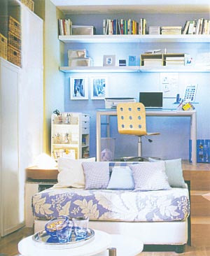 地臺之上,設(shè)計了一個藍(lán)色的小書房,緊靠書房的沙發(fā),就是隱藏在地臺內(nèi)部的雙人床。白天,推進(jìn)地臺的雙人床是一個舒適的沙發(fā),與另一個白色沙發(fā)以及小茶幾圍合出一個其樂融融的沙發(fā)區(qū)。到了晚上,收起茶幾,將雙人床拉出地臺,一張舒適的大床躍然眼前。