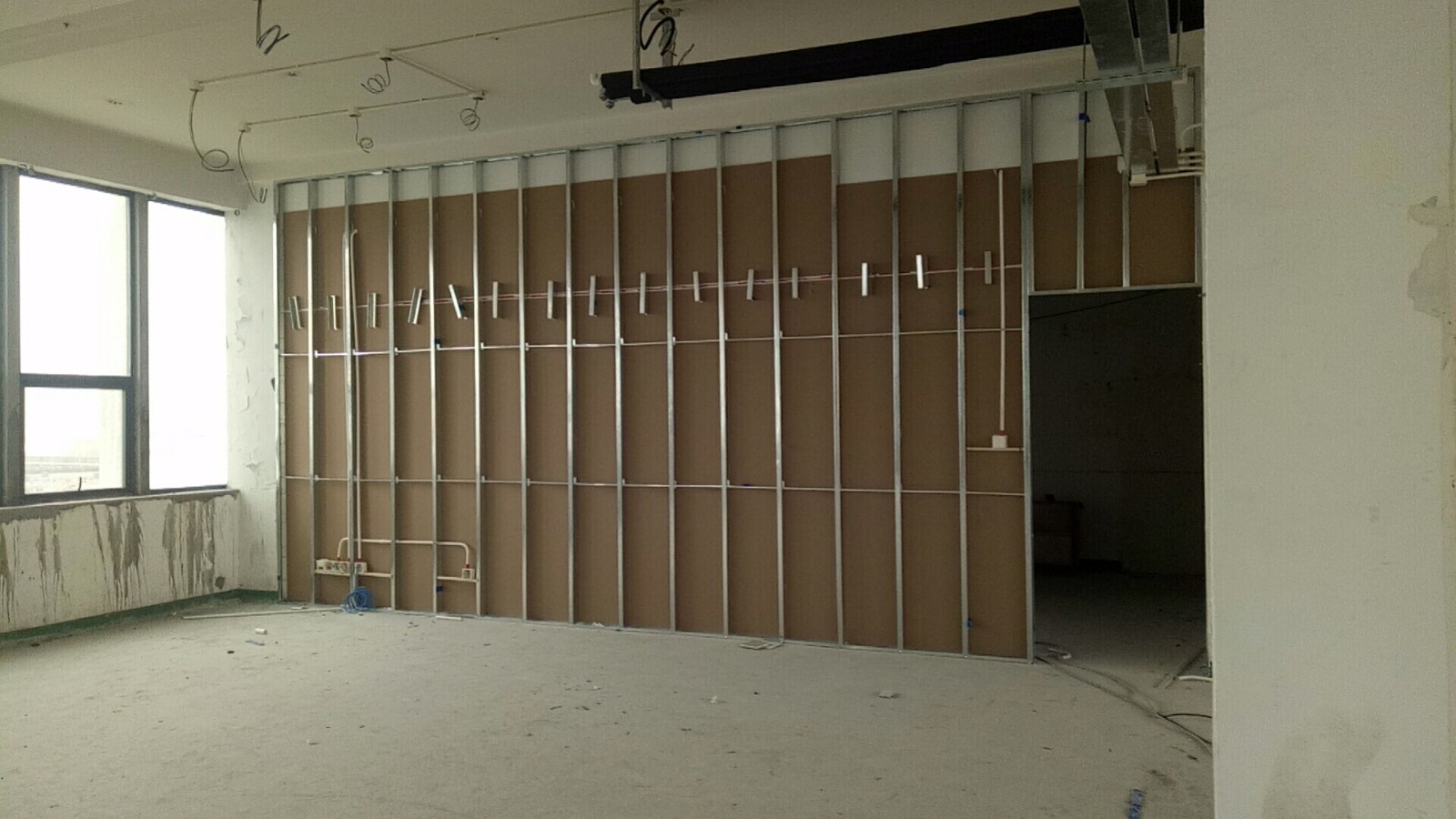 隔斷材料國標,龍骨固定牢固,平整度在2mm內,石膏板拼縫處做了加固處理,垂直度小于2mm,施工規(guī)范。