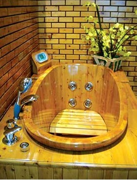 木桶木紋清晰,桶面布滿黑色木結(jié),給人溫馨、自然之感,在浴室貼上木紋理的瓷磚,放一塊仿麻的腳墊等,讓人有一種返璞歸真的感覺(jué)。木桶表面經(jīng)過(guò)抗菌、防腐等技術(shù)處理,底部設(shè)有排水裝置,消費(fèi)者可根據(jù)需要在水中添加花瓣、牛奶、中草藥、精油等,是時(shí)下不少白領(lǐng)女性美容養(yǎng)生的方法。