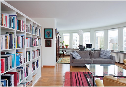 客廳一側(cè)不起眼的純白書架, 塞進(jìn)上五顏六色的書籍立刻不一樣了起來。