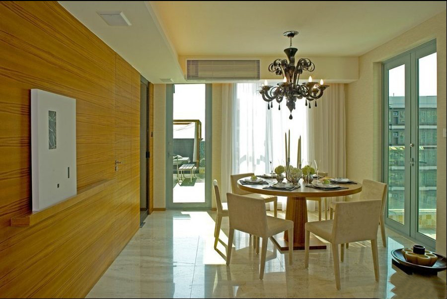 概要: 餐廳與客廳連著臥室的幾階大理石樓梯,淡淡的明黃色墻面,灰白的瓷磚地面,簡約的線條形成這一幅現(xiàn)代感十足裝飾圖。雖然客廳與餐廳是相連在一起的,卻又可以輕易區(qū)分開來,兩扇開闊的落地窗使空間采光非常豐富,坐在餐桌上就餐亦可以欣賞窗外的繁光?! 〔蛷d的另一面是開闊的室外陽臺(tái),兩面都是落地窗,這個(gè)餐廳不謂不是風(fēng)水寶地。餐桌上方的吊燈歐式造型,多了一點(diǎn)浪漫的味道。